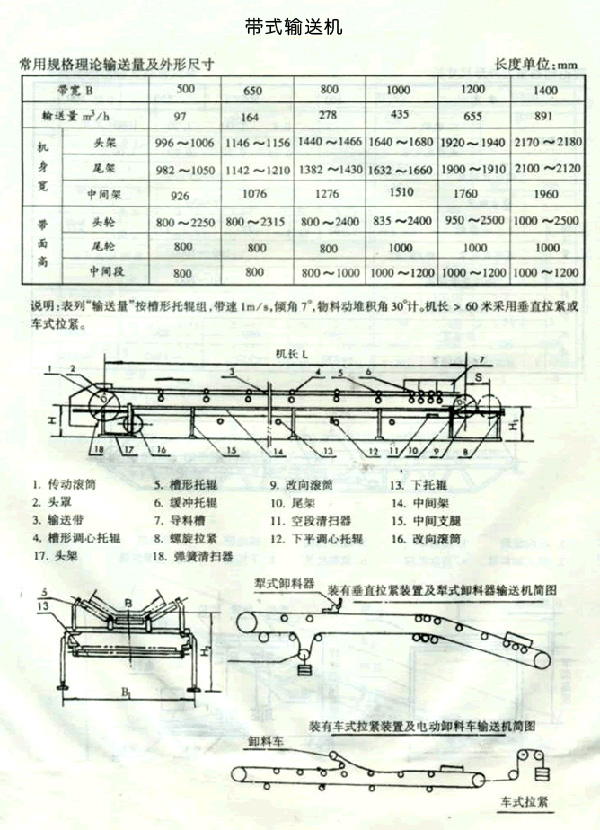 帶式輸送機是一種輸送量大、運轉(zhuǎn)費用低、適用范圍廣的輸送設(shè)備。按其支架結(jié)構(gòu)固定式和移動式兩種;按輸送帶材料有膠帶、塑料帶和鋼帶之分。目前以膠帶輸送機使用最廣;塑料帶是一種新型材料,使用日漸增多;鋼帶主要用于高物料。輸送機的工作環(huán)境溫度一般在-10∽+40°之間,其傾斜角最大不超過30°,要求物料溫度不超過70℃;耐熱橡膠帶輸送120℃以下的高溫物料。物料溫度更高時不宜采用膠帶輸送機。當(dāng)輸送具有酸性、堿性、油類物質(zhì)和有機熔劑等成份的物料時,需采用耐油、耐酸堿的橡膠帶或塑料帶。